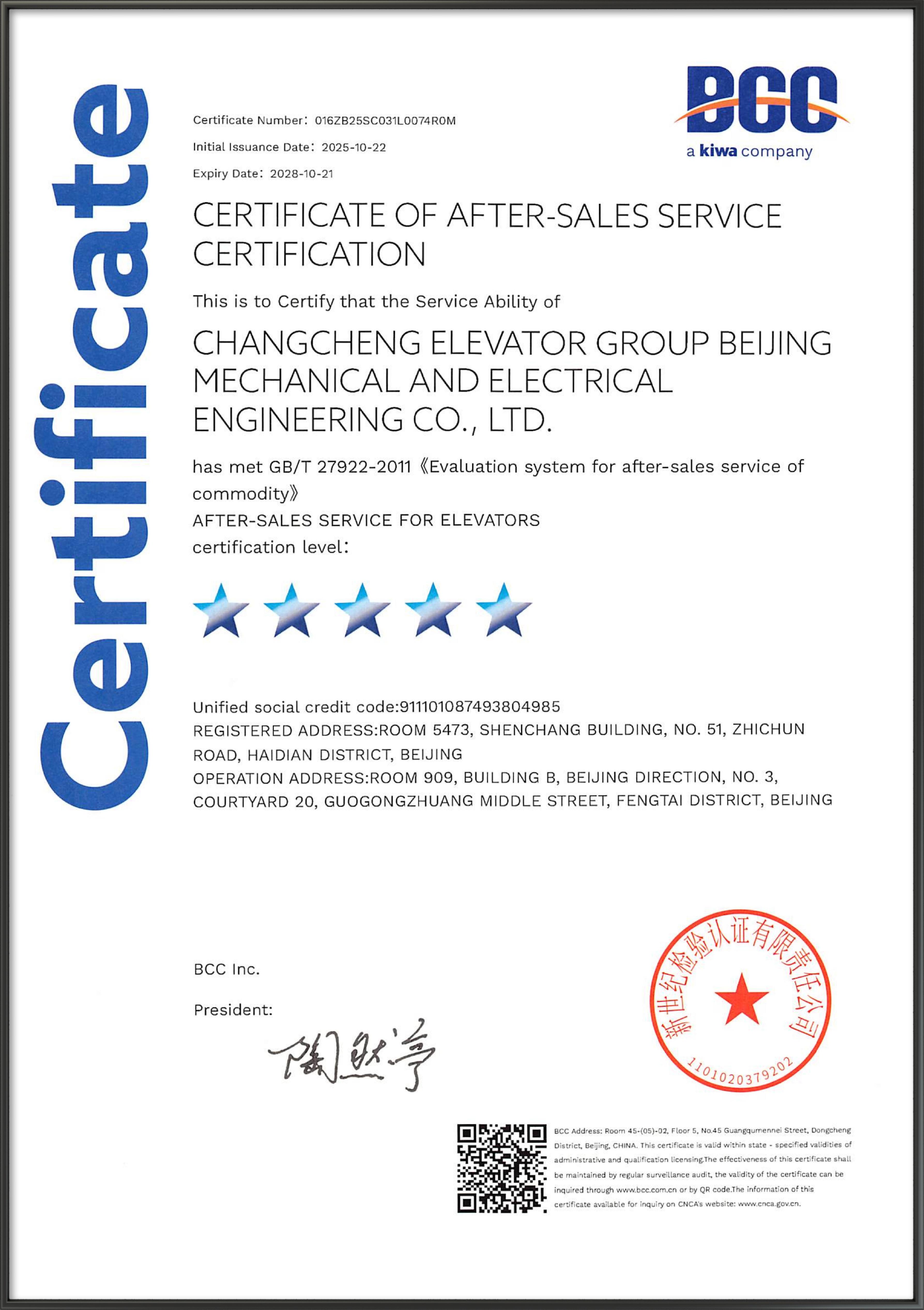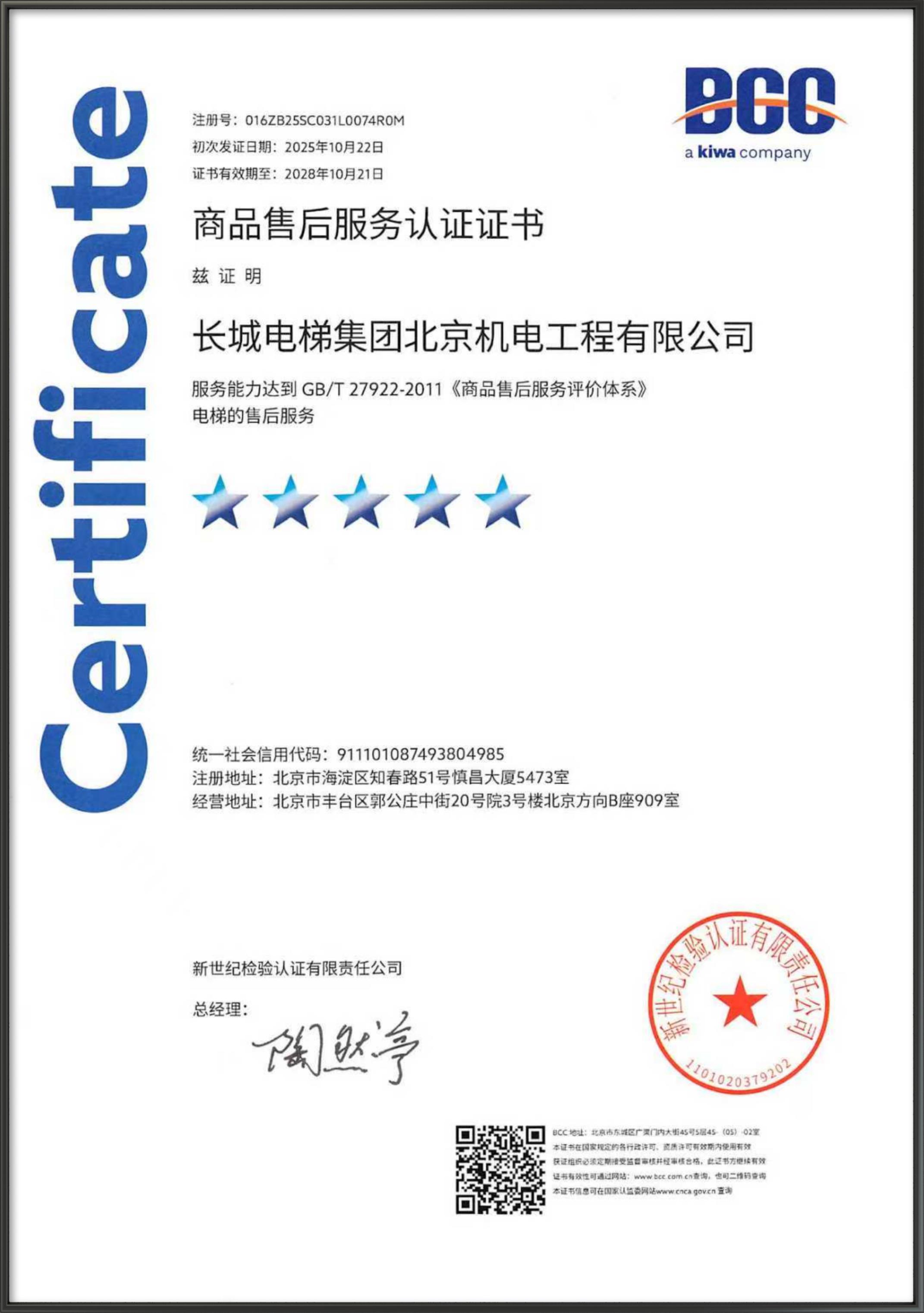 这张五星级认证证书,是一份对客户的郑重承诺。它标志着我们的服务迈上了一个新的台阶,但这不是终点,而是更高的起点。展望未来,北京机电公司将以此为契机,将认证标准融入每一个日常,用五星级的服务守护每一部电梯的安全运行,成为广大客户最值得信赖的伙伴。